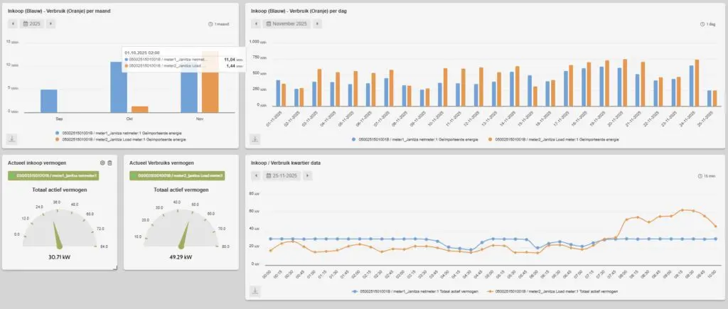 Met een slim portaal ontvang je automatisch periodieke rapporten per e-mail, zodat je de prestaties van je installatie volgt zonder telkens handmatig in te loggen. Daarnaast zorgen gebeurtenisrapporten voor directe meldingen bij storingen of afwijkingen, waardoor je snel kunt ingrijpen en ongewenste situaties voorkomt. Het portaal is volledig naar wens in te richten. Je kiest zelf welke datastromen zichtbaar zijn, zoals verbruik, CO₂-reductie of vermogen. Dat maakt de informatie overzichtelijk en relevant. Ook kun je apparaten, installaties of zelfs verschillende locaties eenvoudig met elkaar vergelijken. Zo herken je afwijkingen sneller en zie je waar optimalisatie mogelijk is. Daarnaast biedt het systeem de mogelijkheid om rapporten te genereren over specifieke periodes. Dit is ideaal voor analyses, audits of het aanvullen van ontbrekende gegevens. Of je nu een week, maand of heel jaar wilt terugkijken: de informatie staat direct klaar.